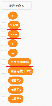 まずは横回転のプログラムを作っていきましょう!カメラ横回転、x-sin、x-cosという変数を作りましょう!