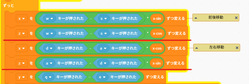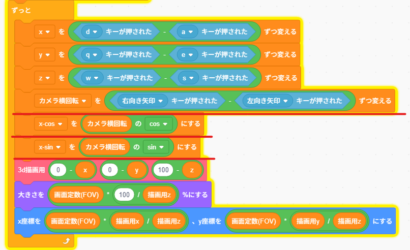 これで、横回転のプログラムは完成です。次に、縦回転のプログラムを作っていきましょう。まず、カメラ縦回転と、y-sin,y-cosという変数を作りましょう。そこに、横回転で作った時と同じようにy-sinにカメラ横回転のsin,y-cosにカメラ横回転のcosを代入というプログラムを作ります。