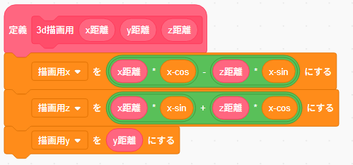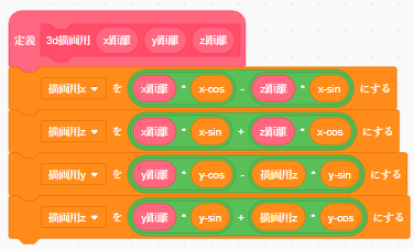 その後、3d描画用の定義ブロックをこのようにプログラムを置き換えます。これは、三角関数を利用して、